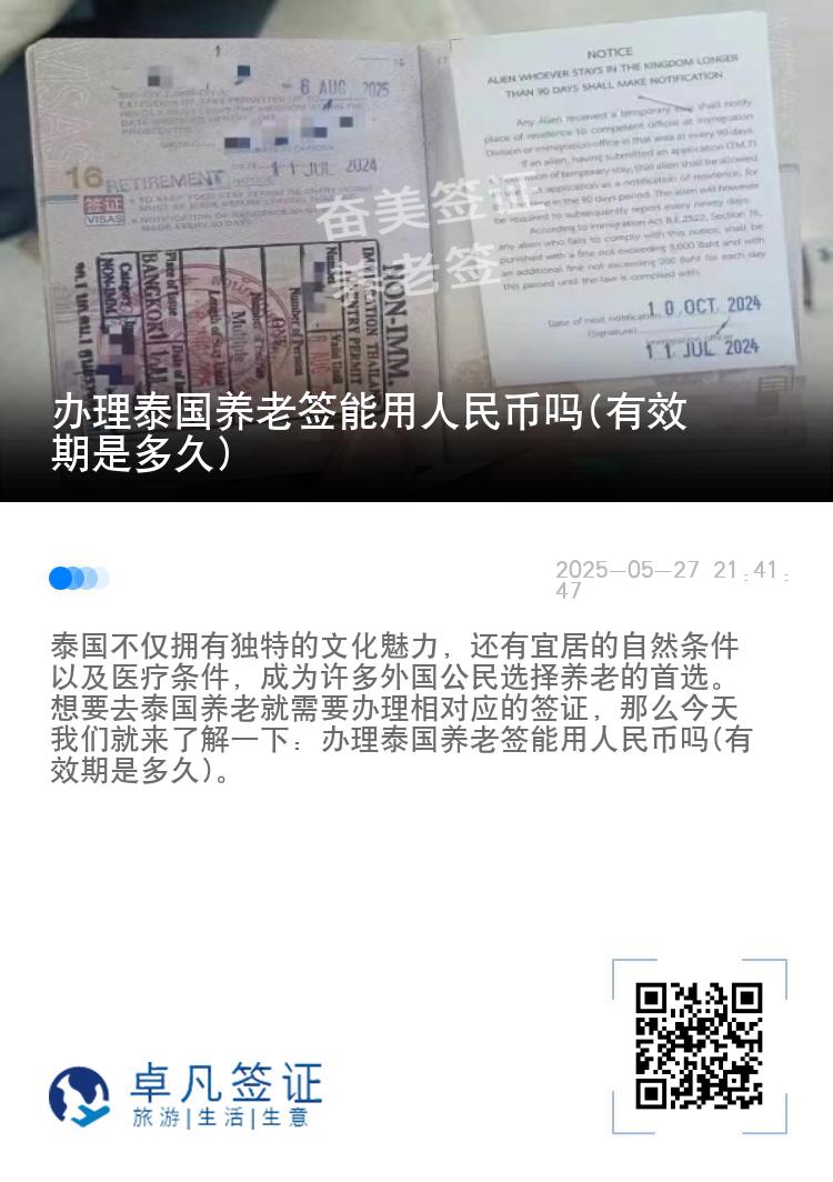 关于《办理泰国养老签能用人民币吗(有效期是多久)》的分享到这里就结束了,相信您阅读完本文章对泰国养老签证也有了一定的了解,如果您觉得本篇文章对您有帮助、欢迎阅读我们奋美其他文章了解更多泰国签证信息。
